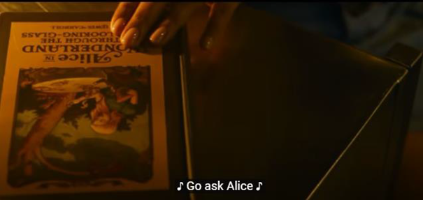 Ardından, hikâyenin ilerleyen bölümlerinde ise Neo bir bara girer ve bir kadınla göz göze gelir. Bu sahnede ise Wachowski, bize yakın çekim “Alice In Wonderland” adlı eserden ağacın açık olduğu bir sayfa, ardından da kitap kapağını gösterir.